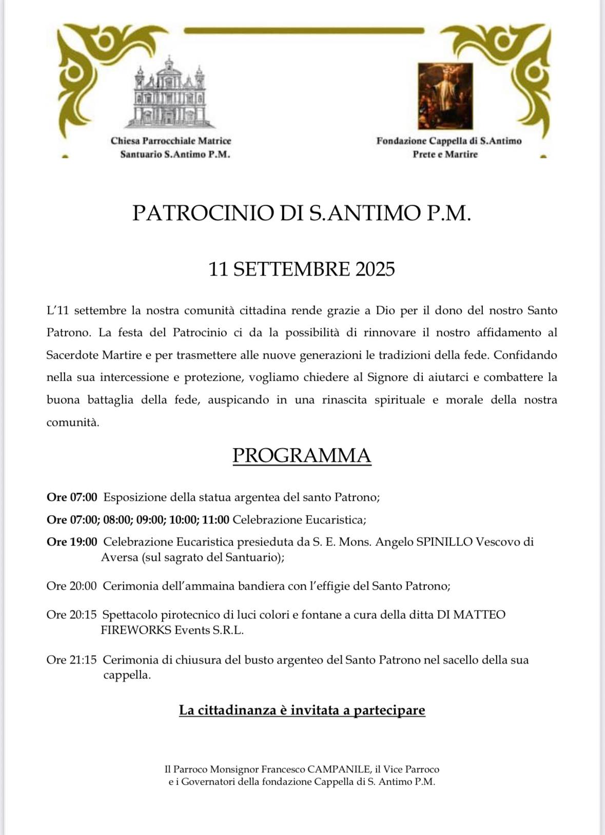 L’11 settembre la nostra comunità cittadina rende grazie a Dio per il dono del nostro Santo Patrono. La festa del Patrocinio ci da l’opportunità di rinnovare il nostro affidamento al Sacerdote Martire e per trasmettere alle nuove generazioni la tradizione della fede. Confidando nella sua intercessione e protezione, vogliamo chiedere al Signore di aiutarci a combattere la buona battaglia della fede, auspicando in una rinascita spirituale e morale della nostra comunità.